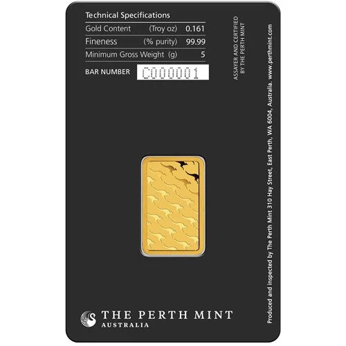 This 5g gold bullion minted bar is one of eight sizes available from The Perth Mint. Key features: 99.99% pure gold Government guarantee Features LBMA registered mark and kangaroo-shaped motif Tamper-evident packaging with serial number Attractive benefits for bullion These