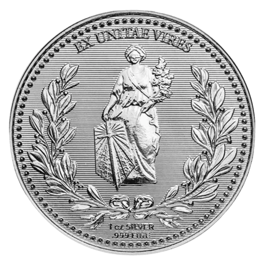 - Reverse: Shows a blindfolded woman holding a sword and shield in one arm and a bouquet of leaves in the other. Above is the Latin phrase, "Ex Unitae Vires."
